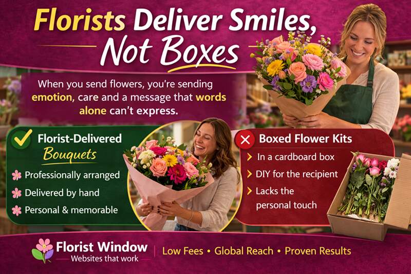 Delivering Smiles Not Boxes27 July 2025 Florists Deliver Smiles, Not Boxes When you send flowers, you're sending more than just blooms you're sending emotion, care and often a message that words alone can’t express. That’s why the way flowers are delivered matters just as much as the flowers themselves. More and more companies now offer next-day flower delivery, promising convenience. But what arrives is often a cardboard box through the letterbox, not a florist-made bouquet. These boxed flower kits leave the recipient with stems to trim, condition, and arrange, it’s DIY floristry wrapped as a gift. It’s a clever business model, but it lacks the charm of a professionally arranged bouquet delivered by hand. Real florists do it differently. Florist-delivered bouquets are designed with expertise, carefully styled, and often arrive in water to ensure freshness. Most importantly, they’re handed over in person. No cardboard. No crushed stems. Just a smile at the door and a beautiful bouquet ready to enjoy. So ask yourself, if you were receiving flowers, would you prefer a flat box or a full bouquet? Which feels like a proper gift? Florists bring more than flowers. They bring presence. They deliver smiles. Boxed flowers are built for the post. Bouquets are built for people. At Florist Window, we’re proud to work with real florists, the ones who provide same-day flowers, wedding designs and funeral tributes, all delivered with care and expertise. We create online shops that allow florists to sell direct, meaning they receive the full value of every sale, without a third party taking a cut behind the scenes. Consumers often don’t realise just how many orders are handled by third-party relay systems. That’s why we’re passionate about promoting the #ShopLocal message and the real #FloristWindow brand. Our website, www.WeAreFlorists.com, might not appear at first glance to be a direct-to-florist service, but once you browse the site and read its message, you’ll realise it’s one of a kind. It’s unique and only possible because we don’t charge for the service we provide. Our clients simply pay a small fixed fee for their own florist website. Then, if they’d like to be part of We Are Florists to help promote real local florists nationally, they can easily opt in from their website admin system. Florist Window builds platforms to help florists get found and sell more online. We're all about the sales, primarily our clients’ sales, not our own. Obviously, we’re always open to welcoming new clients, so if you’re a florist reading this, please check out our prices and get in touch. Thanks for reading. Tim Blog Homepage