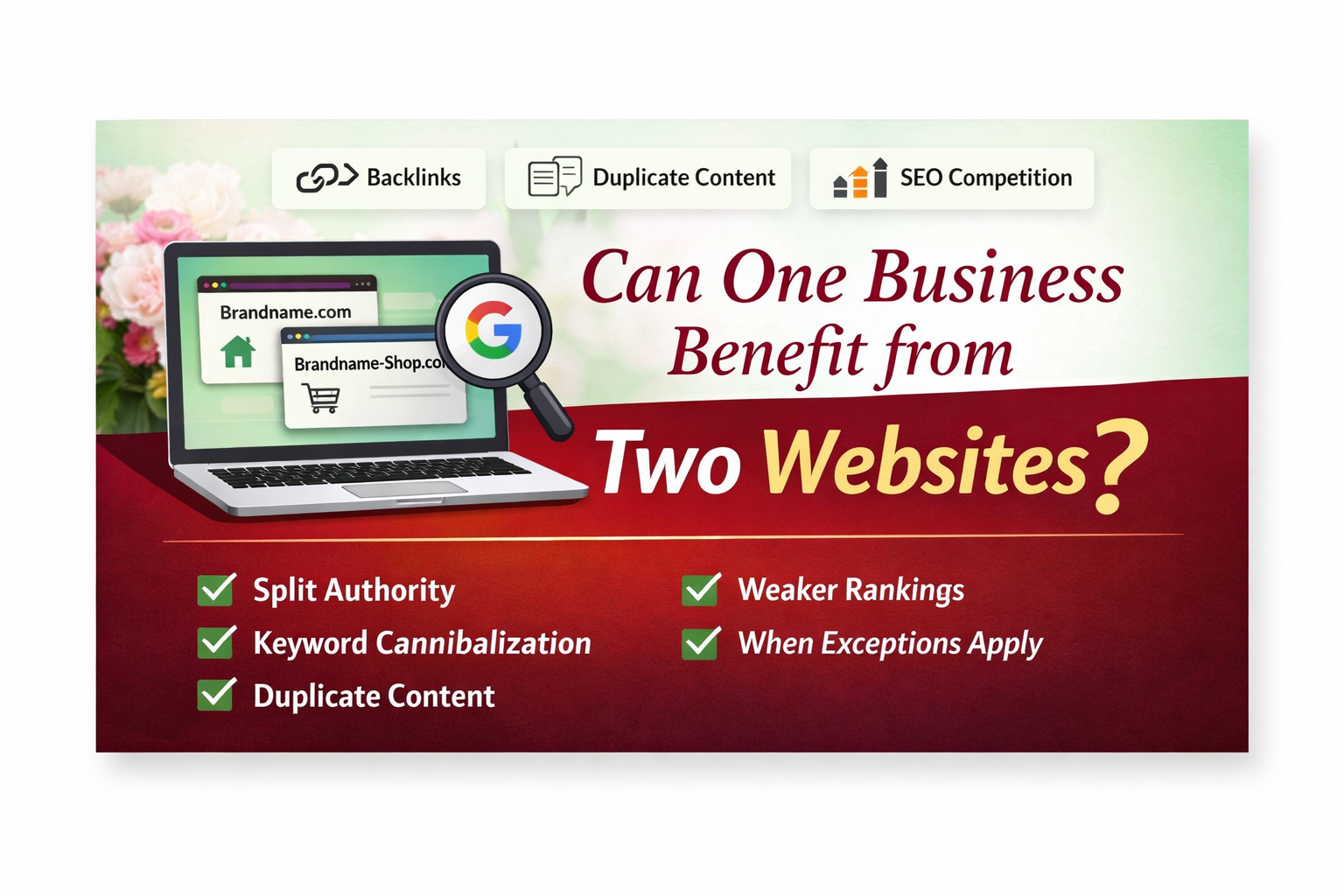 Below is a simple checklist-style explanation of how Google generally sees two websites belonging to the same business, selling the same type of products, from the same address, under the same name. This is not about scare tactics or absolutes. There are exceptions. But for most small businesses, and certainly for most independent florists, the pattern is usually very similar.